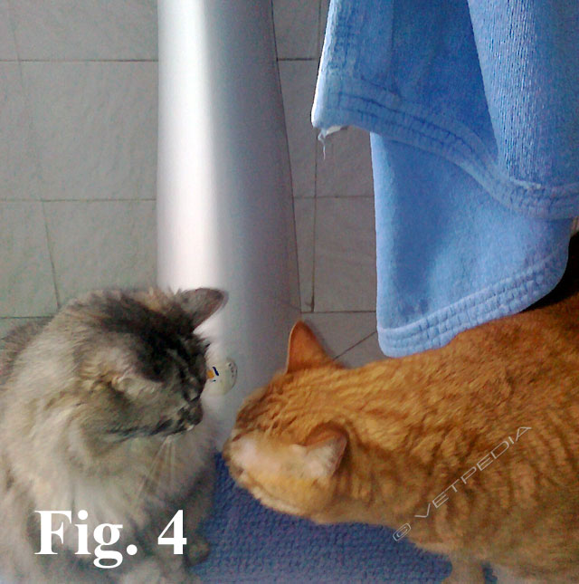 Anche il medico veterinario potrebbe scatenare questa patologia ad esempio dimettendo un gatto dopo un periodo di ospedalizzazione, senza realizzare un’accurata valutazione comportamentale del gruppo di animali conviventi. I gatti residenti possono mettere in atto un comportamento di aggressione nei confronti dell’individuo che era assente creando una patologia chiamata Ansia da coabitazione (Fig. 4)
