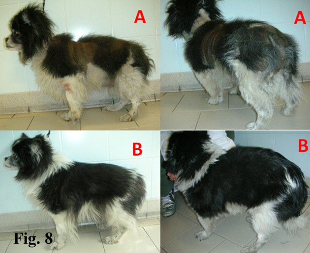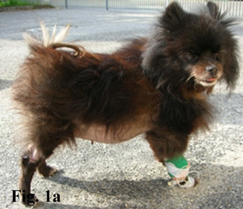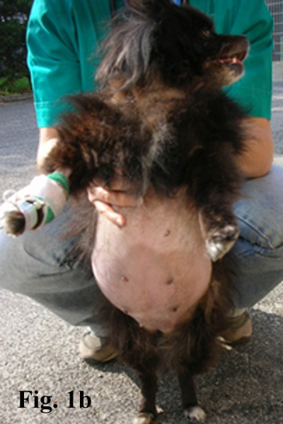Addome a botte (Figg. 1a e 1b): questo sintomo è rilevabile nell’80% dei cani con ipercortisolismo ed è la conseguenza di un aumento del contenuto addominale e di una diminuzione della tonicità dei muscoli addominali dovuta agli effetti proteocatabolici del cortisolo. L’aumento del contenuto addominale è attribuibile alla ridistribuzione dei grassi corporei con accumulo a livello omentale, all’epatomegalia (per infiltrazione lipidica ed accumulo di glicogeno) ed alla sovra distensione cronica della vescica.