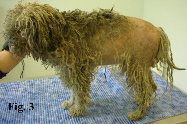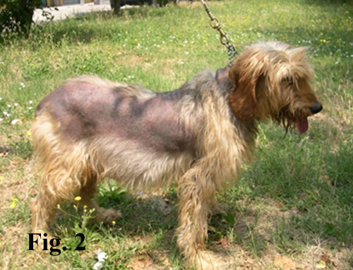 Manifestazioni cutanee: le alterazioni cutanee in corso di ipercortisolismo sono frequenti e solitamente non associate a prurito. L’alopecia simmetrica bilaterale (Figg. 2 e 3) è uno dei sintomi più comuni e si localizza, generalmente, a livello del tronco, risparmiando la testa e gli arti. È il risultato di un’atrofia follicolare e pilosebacea che determina caduta del pelo e mancata ricrescita.