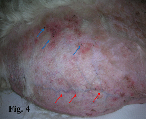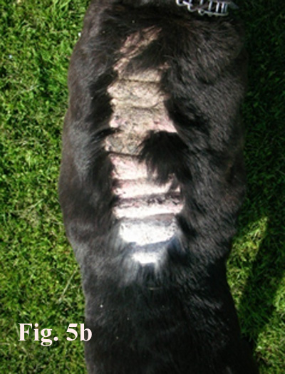 La cute si presenta ipotonica e notevolmente assottigliata, con evidenza della trama vascolare (Fig. 4), tendenza a sviluppare ematomi, petecchie e soffusioni. Inoltre, la cute è più soggetta ad infezioni secondarie, conseguenti all’effetto immunosoppressivo dei glucocorticoidi, sostenute da batteri, miceti o acari (ad esempio demodicosi). Spesso si evidenziano comedoni (Fig. 4) attorno ai capezzoli e lungo la linea mediana dorsale, e a volte possono essere presenti lungo tutto il tronco; non di rado vi è la presenza di aree di iperpigmentazione focale o diffusa. Rilievo meno comune (2-8%), è invece la “calcinosis cutis” (Fig. 5 a e b), cioè una deposizione distrofica di calcio nel derma e nel sottocute, di cui non si conosce ancora completamente il meccanismo eziopatogenetico.