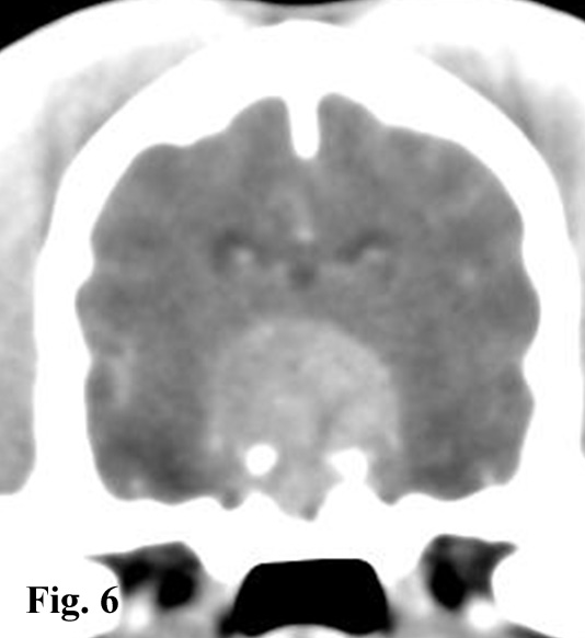 I tumori di grandi dimensioni si individuano facilmente in immagini TC con mezzo di contrasto, per la loro grandezza e per la loro forma alterata (Fig. 6), mentre a volte possono essere difficili da visualizzare senza mezzo di contrasto. Nel 50-60% dei cani con ipercortisolismo ipofisario, si può individuare una massa ipofisaria tramite TC; nel rimanente 40-50% dei casi, la patologia è causata da un microadenoma di dimensioni inferiori a 3-4 mm, che non è visibile neanche con contrasto.