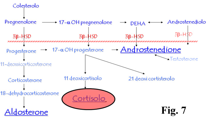 Il trilostano è un inibitore competitivo del 3β-idrossisteroido-deidrogenasi ed è attualmente l’unico farmaco approvato in Italia per la terapia dell’ipercortisolismo canino. Questo enzima media la conversione del pregnenolone a progesterone e del 17-idrossipregnenolone a 17-idrossprogesterone (Fig. 7). Il cortisolo, l’aldosterone e l’androsteneidione sono prodotti a partire dal progesterone e dal 17-idrossipregnenolone (Fig. 7). Il trilostano inibisce la produzione di progesterone e di 17-idrossiprogesterone, con conseguente riduzione della sintesi dei vari steroidi prodotti dalle surrenali, dalle gonadi e dalla placenta.