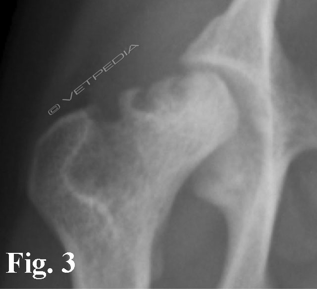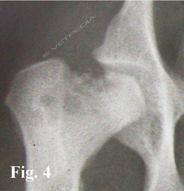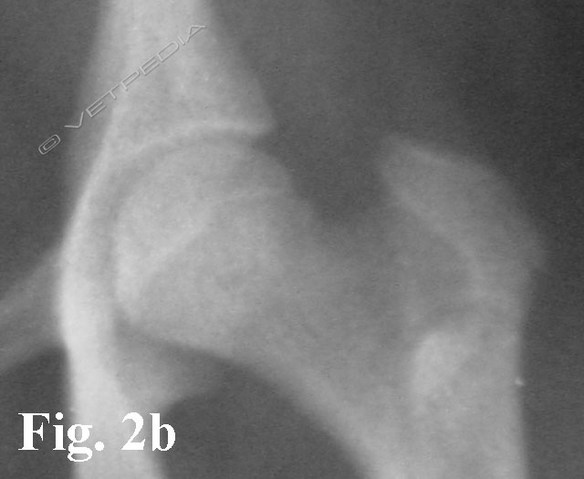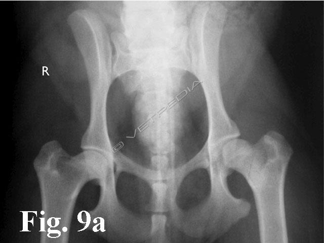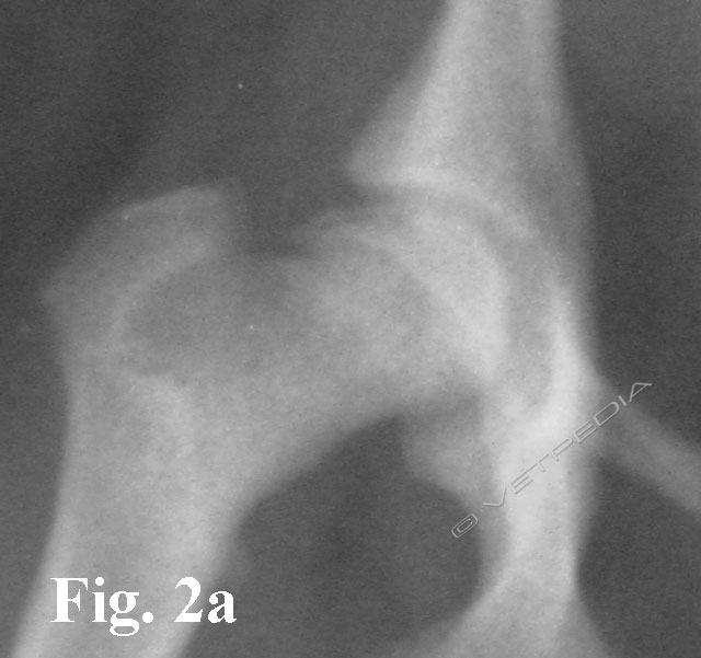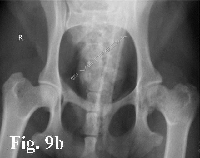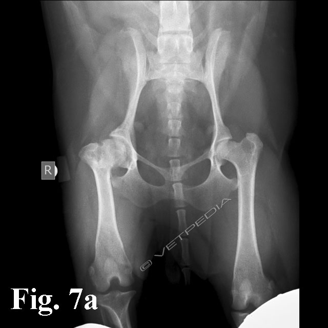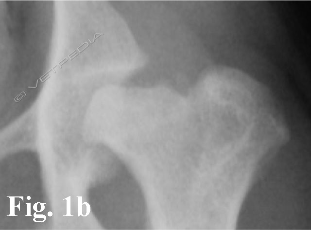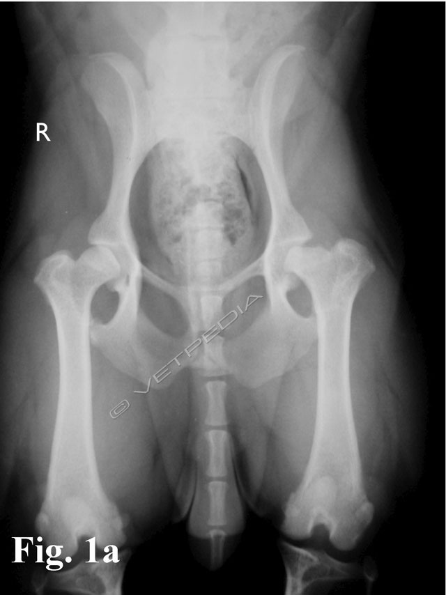 Alla visita ortopedica osserviamo algia all’estensione e all’abduzione dell’articolazione coxofermorale e possiamo apprezzare il differente trofismo muscolare nei casi monolaterali, che si rende maggiormente evidente con il cronicizzarsi della lesione. Il sospetto diagnostico emesso dalla visita clinica viene confermato mediante l’esecuzione di uno studio radiografico dell’articolazione coxofemorale. Per emettere una diagnosi è generalmente sufficiente eseguire una proiezione ventro-dorsale del bacino ad arti estesi (Figg. 1a e b). L’esame radiografico evidenzia un ampiamento irregolare della rima articolare, aree focali di radiotrasparenza a livello della testa e del collo femorale, associate ad alterazioni del profilo e della forma della testa femorale. Con il cronicizzarsi della lesione di osservano fenomeni degenerativi che portano ad intenso riassorbimento del tessuto osseo ed a collasso della testa femorale. Radiograficamente è possibile classificare la necrosi asettica della testa del fermore in 5 stadi in relazione alla gravità ed alla progressione della malattia, secondo quanto proposto da Ljunggren nel 1967.