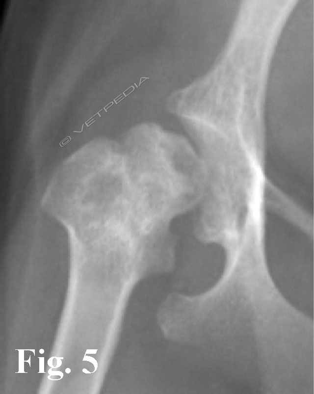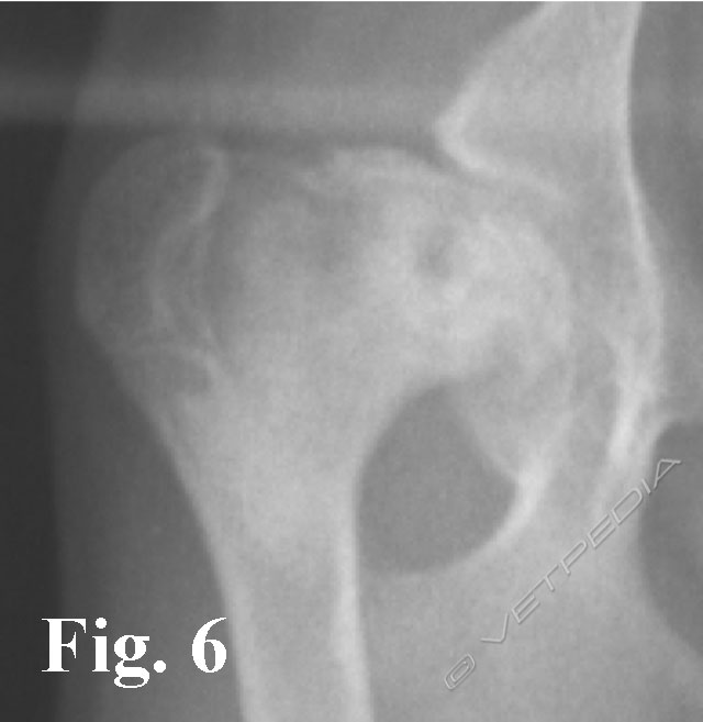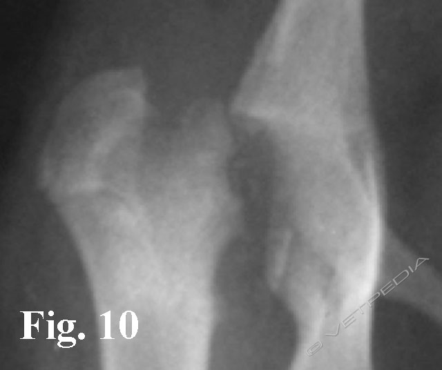Il recupero funzionale dopo l’ostectomia della testa e del collo del femore è generalmente buono, considerando la piccola taglia dei cani affetti da questa patologia, dove l’artroplastica escissionale consente i migliori risultati funzionali. Gli insuccessi possono dipendere da una tecnica chirurgica eseguita non correttamente (ostectomia incompleta del collo femorale con persistenza di uno sperone osseo) (Fig. 10) o da un mancato carico dell’arto protratto per molto tempo e conseguente eccessiva ipotrofia della muscolatura. In quest’ultimo caso la ripresa funzionale potrà essere più lenta o non completamente soddisfacente.