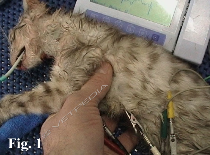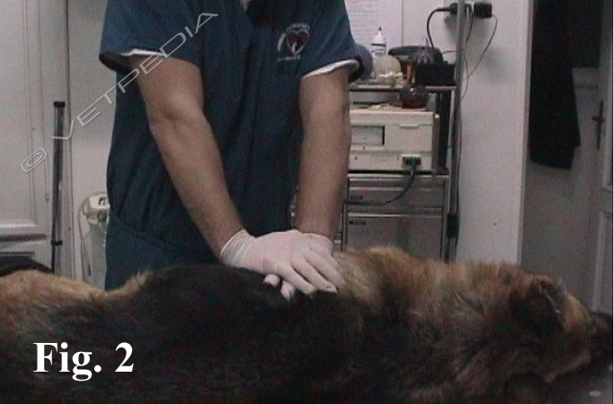 Quando l’arresto respiratorio si trasforma in arresto cardio-respiratorio e a livello periferico non è più percepibile il polso si deve effettuare il massaggio cardiaco. Ripristinata quindi la pervietà delle vie aeree e la ventilazione il massaggio cardiaco esterno è attuato attraverso la compressione toracica a livello dell’area cardiaca (4-5 spazio intercostale sinistro) (Fig.1) con il paziente in decubito laterale destro; se il paziente pesa non più di 15 kg viceversa è preferibile porre il paziente in decubito dorsale con l’ausilio di una culla per cani o di sacchetti di sabbia utilizzati per eseguire i radiogrammi. Nei pazienti di taglia grande è più difficile effettuare delle compressioni atte ad assicurare un’adeguata gittata cardiaca, perfusione coronaria e cerebrale.