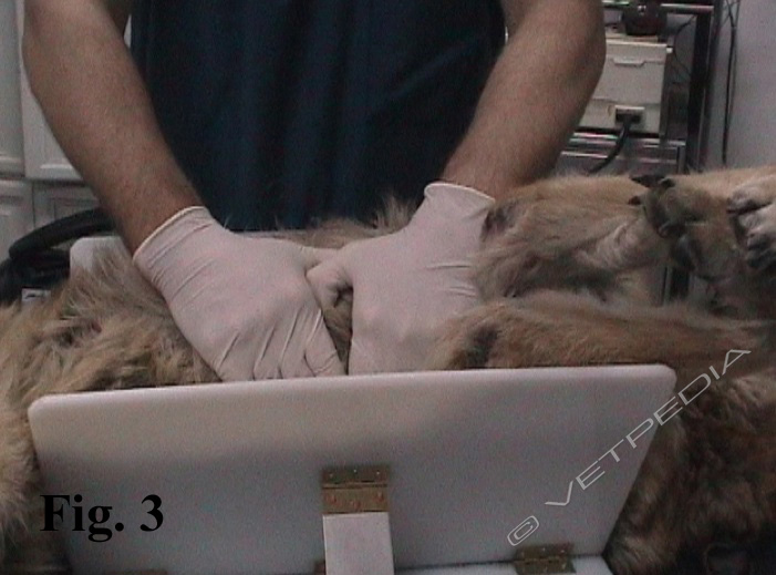 Quando la RCPC è eseguita da un solo operatore, si eseguono 2 ventilazioni ogni 15 compressioni toraciche diversamente quando gli operatori sono 2 o più, si eseguono 3-5 compressioni tra una ventilazione e l’altra. La frequenza delle compressioni deve essere è di circa 120/min nei pazienti fino ai 7 kg, nei pazienti maggiori di 7 kg la frequenza delle compressioni deve essere di 100/min. La forza compressoria da porre sul torace deve essere tale da produrre una deformazione dell’arco costale. Nei pazienti di taglia piccola la compressione è effettuata a livello dell’area di proiezione cardiaca sull’emitorace, mentre nei cani maggiori di 7 kg può essere effettuata nella porzione più convessa della parete toracica sfruttando l’effetto della pompa toracica, o meglio in decubito dorsale (Figg. 2 e 3).