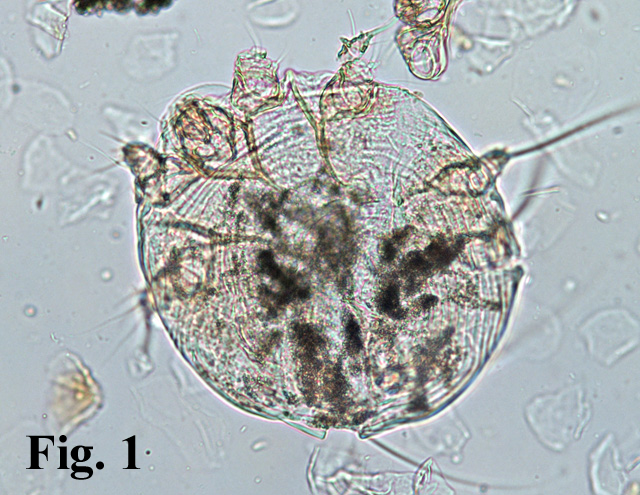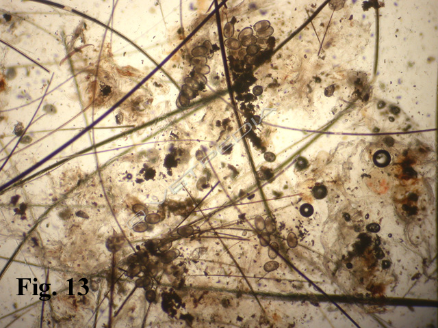 La tecnica d’elezione per il prelievo del materiale da esaminare al microscopio è il raschiato cutaneo superficiale che in corso di rogna notoedrica, a differenza di quanto accade per la rogna sarcoptica, consente sempre di evidenziare un numero elevato di acari (Figg. 12, 13).
