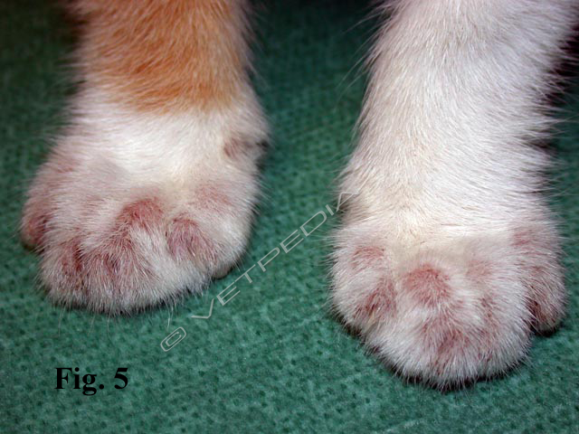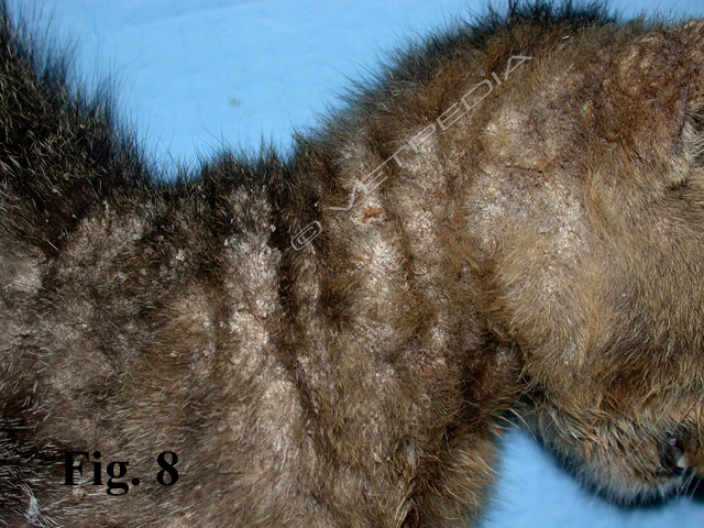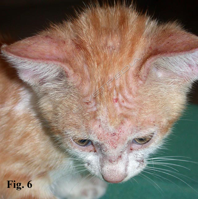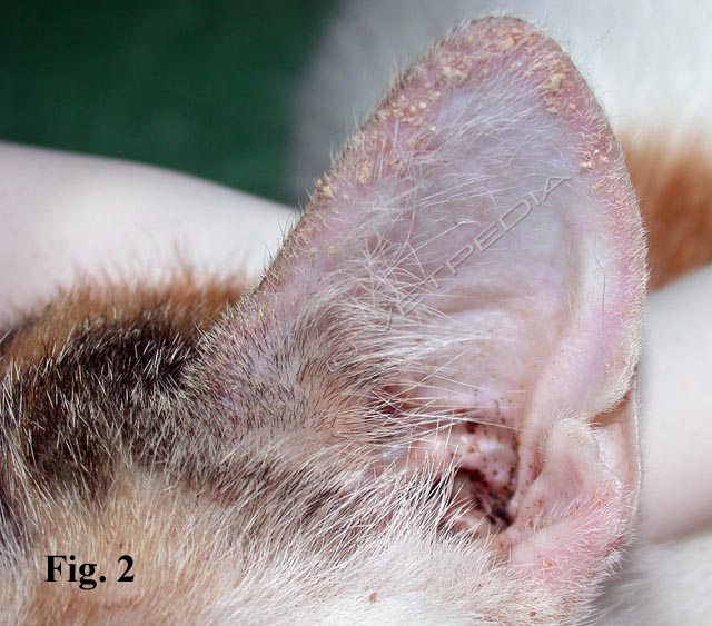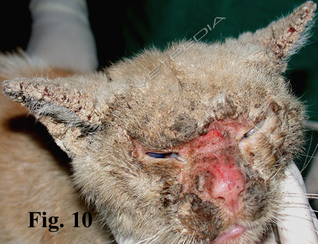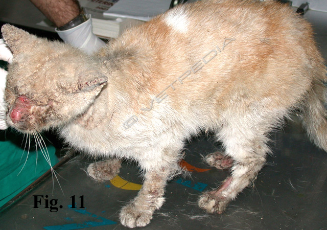 La distribuzione delle lesioni è piuttosto caratteristica: nelle fasi iniziali si osservano lesioni sul bordo del padiglione auricolare che rapidamente tendono ad estendersi sulla cute di tutto il padiglione (Figg. 2, 3, 4). Altre sedi in cui si osservano inizialmente le lesioni sono la faccia, il muso ed il collo. Le comuni operazioni di toelettatura svolte dai gatti e la loro abitudine a dormire raggomitolati favorisce la diffusione delle lesioni agli arti e alla regione perineale (Fig. 5). Le lesioni iniziali sono rappresentate da papule crostose e da scaglie che, con il progredire della malattia, vengono sostituite da spesse croste grigio-giallastre tenacemente adese alla cute, che ricoprono la cute dei padiglioni auricolari, della testa e del collo, conferendo alla cute un caratteristico aspetto rugoso e plissettato (Figg. 6, 7, 8, 9). Il prurito è solitamente intenso per cui sono frequenti lesioni secondarie da autotraumatismo (alopecia, erosioni ed ulcere) (Fig. 10). Le lesioni spesso generalizzano su tutto il corpo nei soggetti non curati e soprattutto in quelli immunodepressi da FIV o FeLV (Fig. 11).