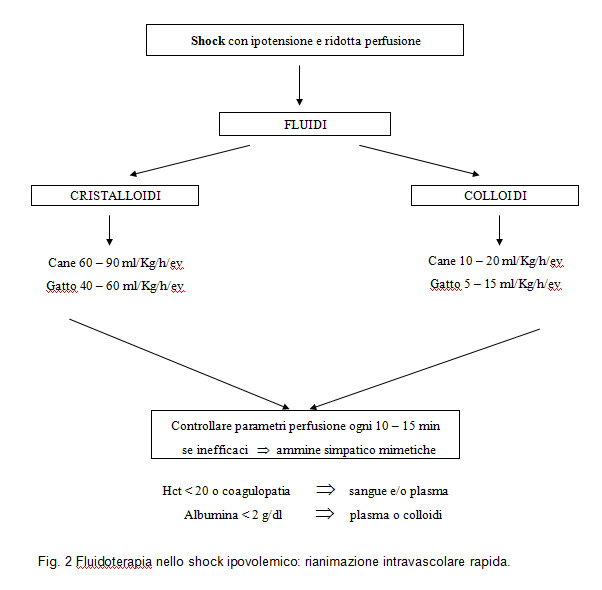 Infusione. Quando i pazienti affetti da shock hanno un volume circolante non sufficiente ad assicurare una buona gittata cardiaca è necessaria una fluidoterapia aggressiva per ripristinare un circolo efficace. In alcuni casi, quando il letto vascolare non è adeguato al volume circolate (ad esempio vasodilatazione conseguente a sepsi grave o shock settico) può essere utile associare alla fluidoterapia la somministrazione di farmaci vasoattivi (ad es. dobutamina, dopamina o noradrenalina). Per ripristinare rapidamente una circolazione efficace é possibile somministrare soluzioni cristalloidi ad alta velocità quali ad esempio NaCl 0,9%, Ringer lattato (LRS) e soluzione elettrolitica di reintegrazione con sodio gluconato (Normosol R). In corso di acidosi metaboliche le soluzioni preferite sono quelle bilanciate come la soluzione elettrolitica di reintegrazione con sodio gluconato o la Ringer Lattato. La velocità di infusione delle soluzioni cristalloidi in corso di shock ipovolemico, conosciuta anche come “dose shock”, è di 40-90 ml/kg/ora/ev/io nel cane e 25-55 ml/kg/ora/ev/io nel gatto (Fig. 2).
